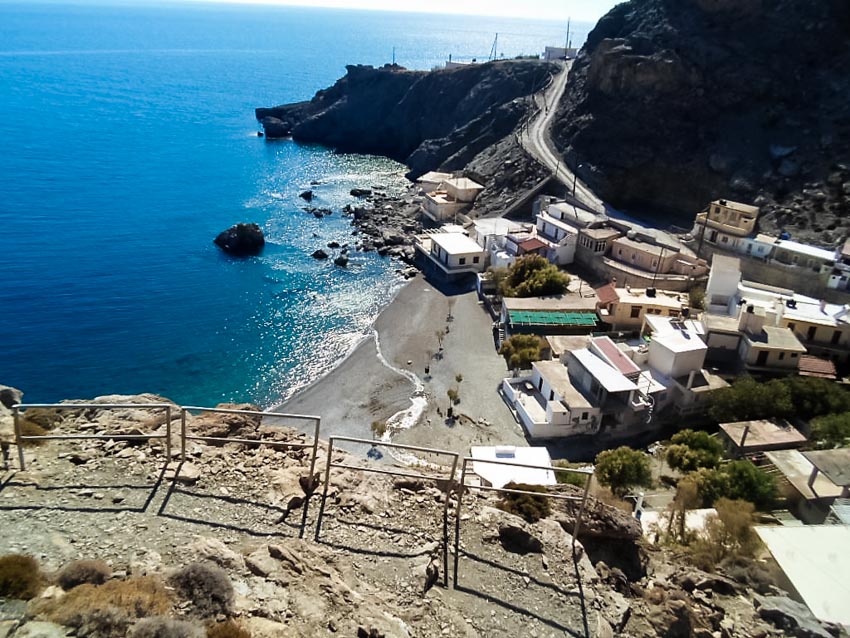 Σε 30 λεπτά περίπου το μονοπάτι περνά μέσα από το μικρό οικισμό Μαριδάκι ή Αγιο Παντελεήμονα. Είναι άναρχα χτισμένος μέσα στο άγριο και ξερό τοπίο της Νότιας Κρήτης, στην έξοδο του φαραγγιού του Αχεντριά. Πηγές με πόσιμο νερό σχηματίζουν ποταμάκι που τρέχει ως τη θάλασσα και σε μια υπέροχη παραλία. Στην πλατεία με τα πλατάνια θα βρείτε ένα καφενείο-ταβέρνα με ντόπια παραδοσιακά εδέσματα. Το Μαριδάκι είναι από τα λίγα μέρη της Κρήτης, που η πρόσβαση με τα πόδια είναι πολύ πιο γρήγορη απ’ ότι με αυτοκίνητο. Μόλις περάσετε τον οικισμό θα δείτε έναν απάνεμο κόλπο με δύο όμορφες παραλίες, που οι ντόπιοι ονομάζουν Νησάκια λόγω δύο μικρών βράχων στη θάλασσα.
