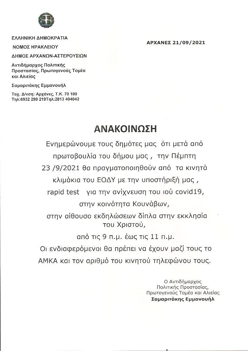 Πραγματοποίηση Ιχνηλάτησης ανίχνευσης του Ιού covid19 με Rabit Test στους Κουνάβους του Δήμου Αρχανών Αστερουσίων
