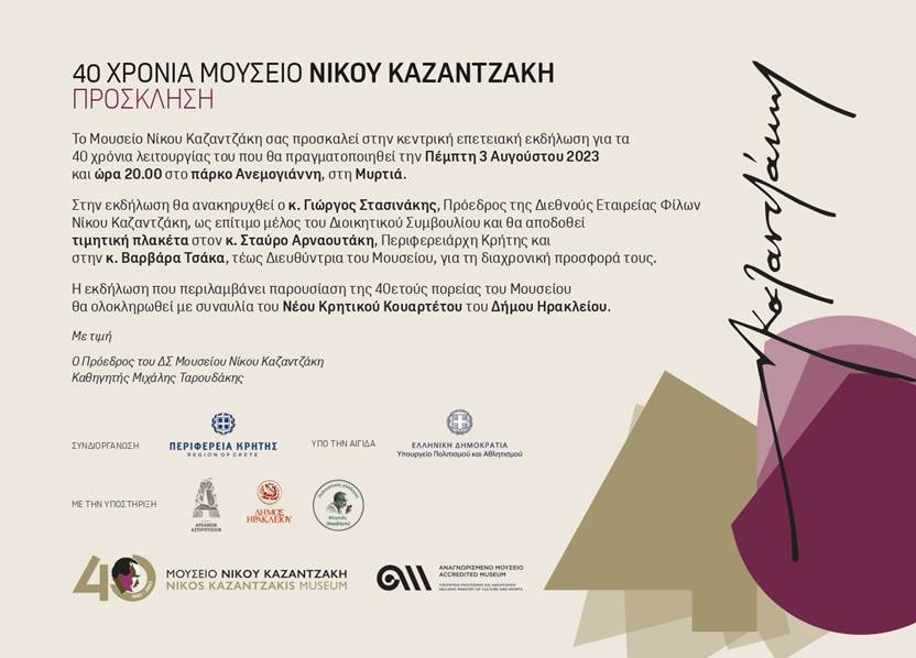 Κεντρική Επετειακή Εκδήλωση - Πέμπτη 3 Αυγούστου 2023 Μουσείο Νίκου Καζαντζάκη